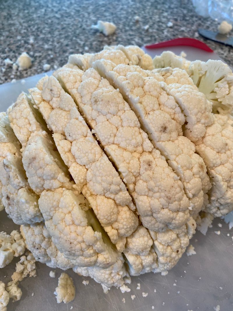 Cut off the butt and leaves of the cauliflower. Wash it and boil it whole for about 10 minutes. Slice it in half through the top of the cauliflower, then cut into 1 inch thick steaks. You should be able to get at least 4 good size steaks depending on the size of your cauliflower. The rest may crumble but it’s all good!