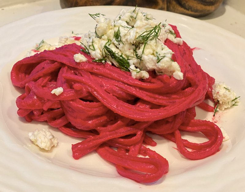 Cook 1 pound of your favorite pasta al dente. Save a little bit of the pasta water while it’s cooking, this will help to thin the beet pesto. Set pasta aside and drizzle with a little olive oil.I used a white linguine because I really wanted to taste the flavor of the beets!