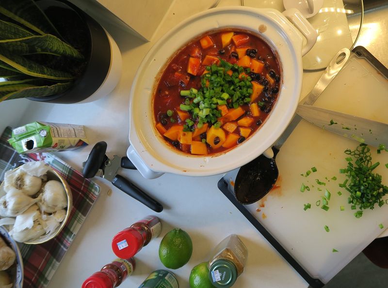 Add butternut squash, black beans, chopped scallions, and corn. Mix well.
