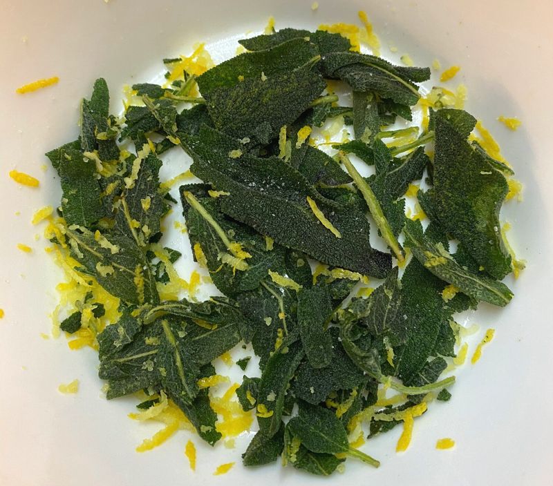 In a non-stick skillet, heat up 3 tablespoons of olive oil, then add the sage leaves. The smell is amazing! Cook them for 2 minutes, and transfer the leaves to a bowl with the lemon zest. Set aside.