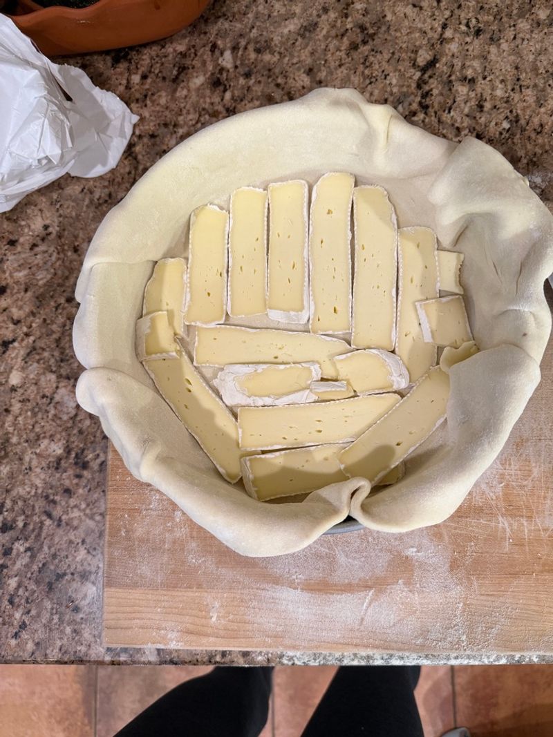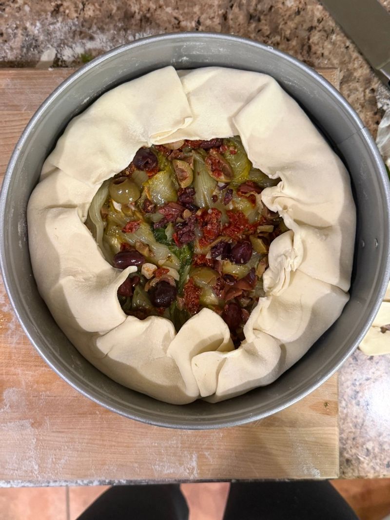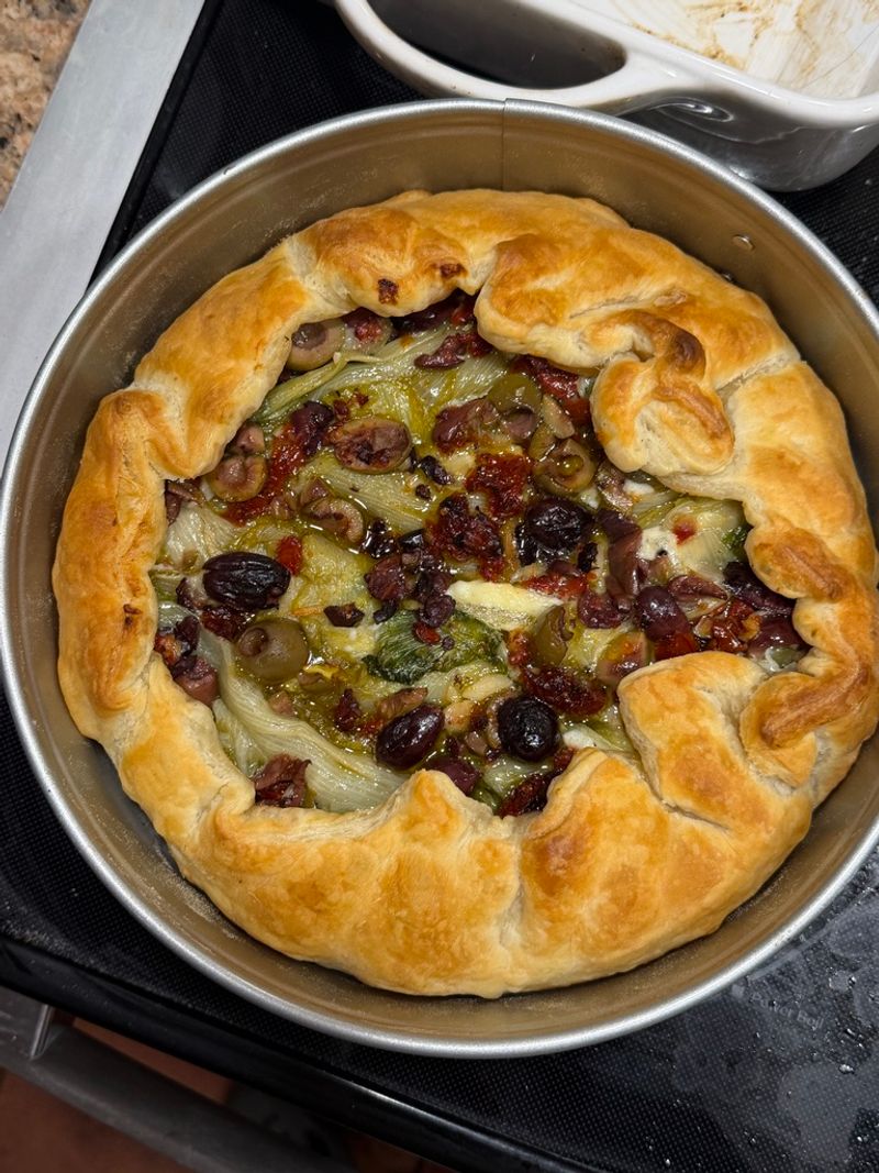 Layer the tart by adding brie cheese, the cooked escarole, then chopped sundried tomatoes and olives.