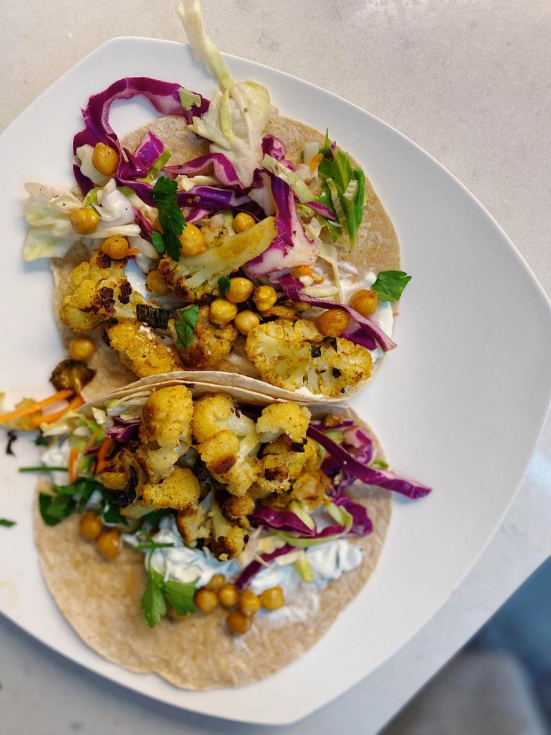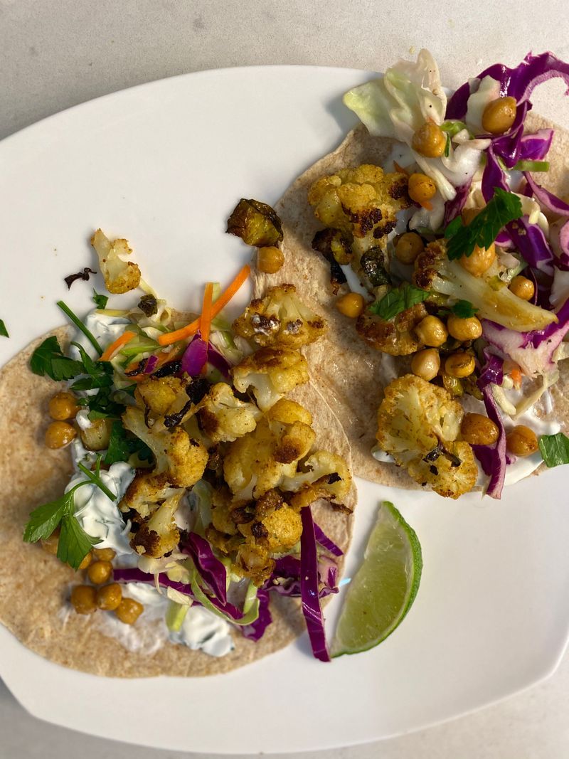 Lay out the wraps and coat with sour cream, followed by the cauliflower chickpea filling. Top with the slaw, cilantro, lime juice and hot sauce!