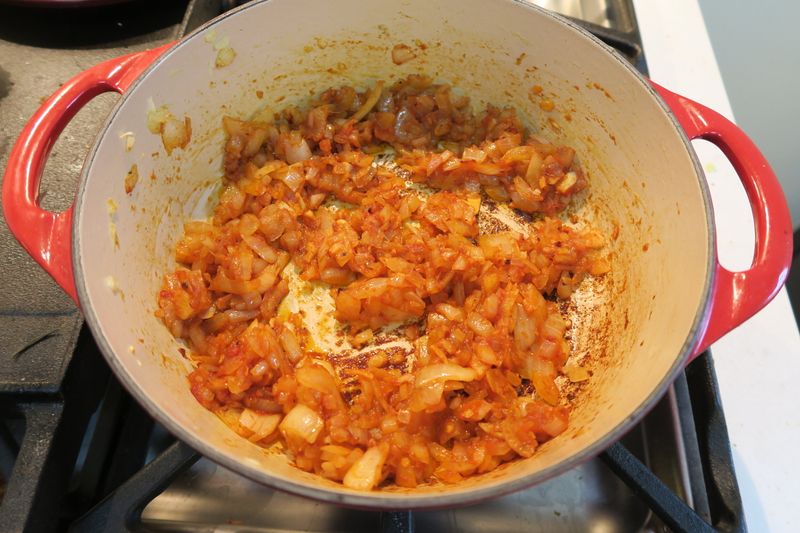 1. Heat up olive oil in a pot, then throw in onion and minced garlic. Sauté for 5ish minutes on medium heat. Then, stir in cumin, tomato paste, salt and pepper, chopped carrots, red pepper chili flakes, and ginger. Cook for 5 minutes on low.