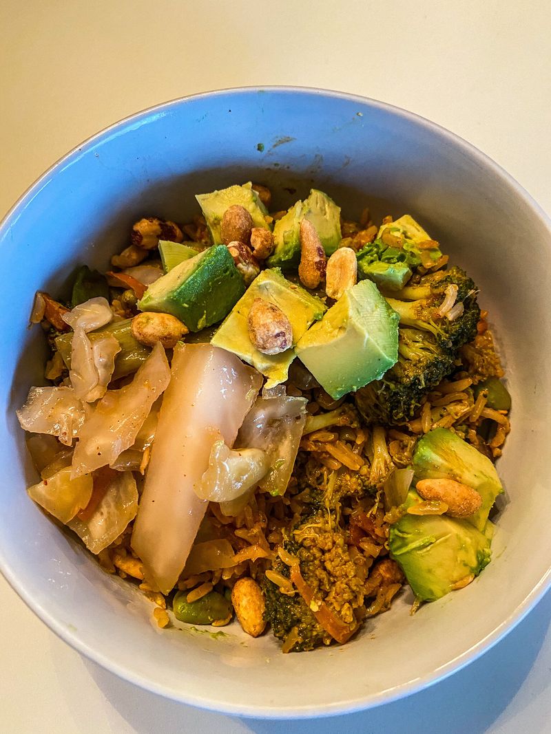 The base is brown rice mixed with nutritious vegetables tossed in a delicious soy curry sauce. Top this bowl with dry roasted peanuts, kimchi, avocado, tofu, the list goes on. Fried rice from your favorite take out restaurant is delicious, but not always nutritious. This dish is a great way to recreate your favorite stir fry in the comfort of your own home.
