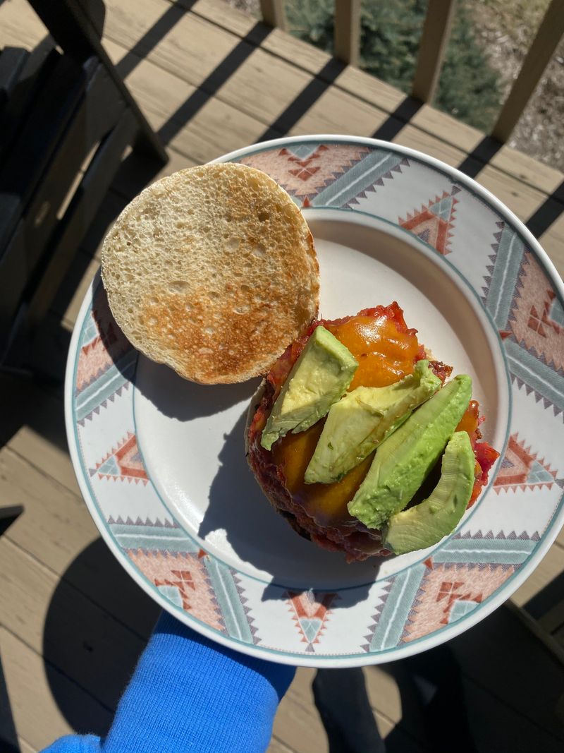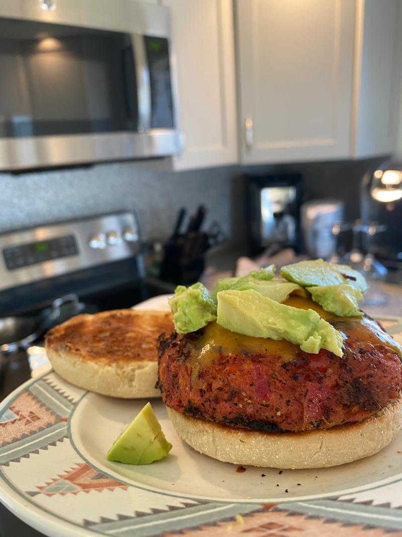 In a non stick skillet, coat the pan with a few tablespoons of olive oil. Add the patty and cook on both sides for 3-4 minutes! (You can also bake it, but found that this was the best method with some cheddar cheese, avocado, and ketchup on a whole grain english muffin)